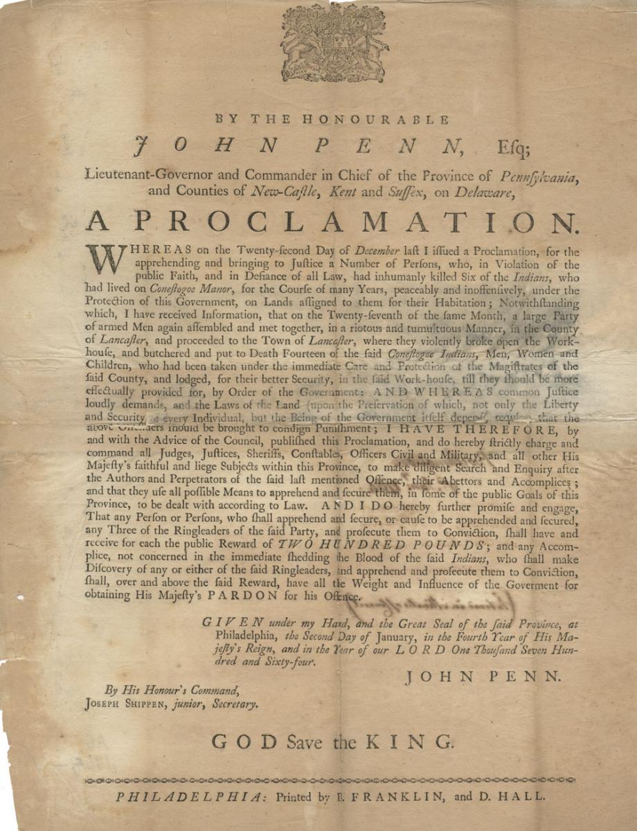 This proclamation calls for the arrest of the Paxton Boys. Pennsylvania Governor John Penn had issued one following the Conestoga Massacre, and then another at the beginning of January – the month that the Paxton Boys marched on Philadelphia.