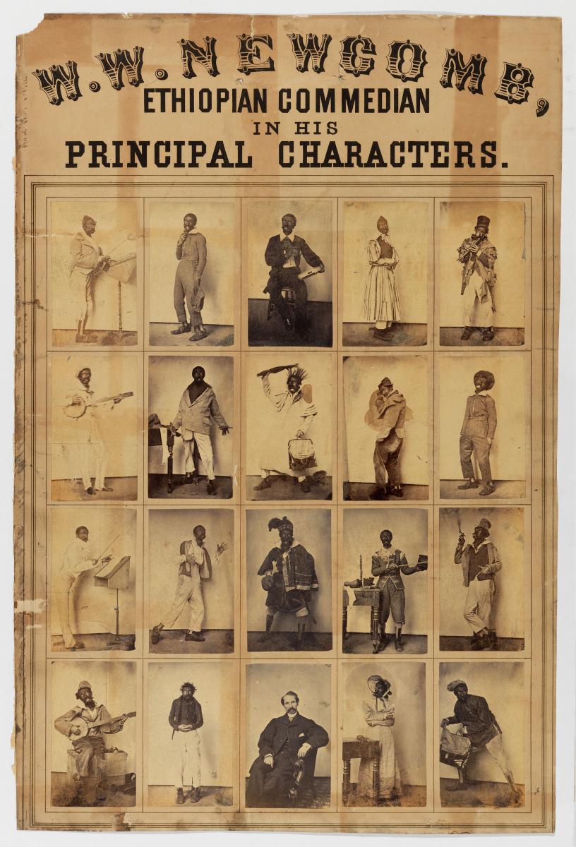 A series of pictures of minstrel actor W. W. Newcomb, expressing comedy by poking fun at black people’s challenges living in America. He mocked the way they talked, walked, dressed, danced, and used facial expressions.